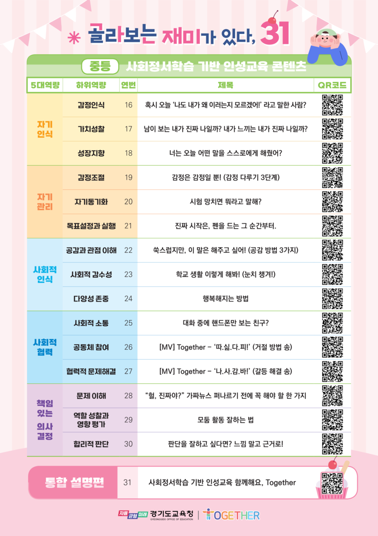 자료는 모두 31편(초등 15편, 중등 15편, 통합설명 1편)으로 제작해 골라서 보는 재미를 느낄 수 있다. 학교와 가정에서는 제공된 콘텐츠를 ▲교육과정 연계 ▲학급 운영 및 교원 연수 ▲가정 연계 인성교육 자료로 다양하게 활용할 수 있다.