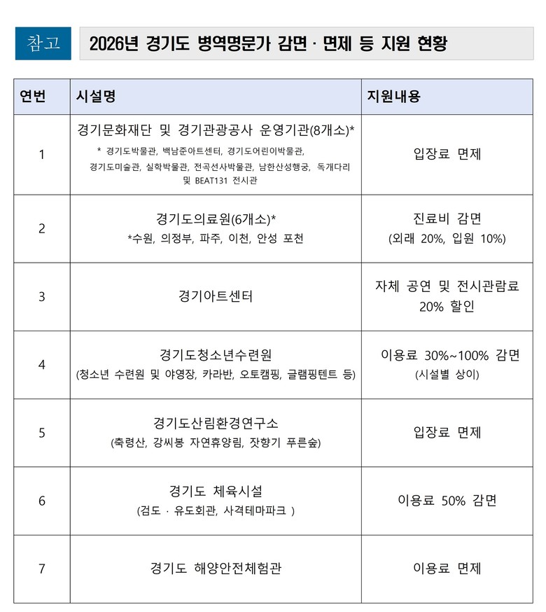 경기도는 현재 병역명문가에 경기문화재단과 경기관광공사가 운영하는 문화시설(박물관, 미술관, 전시관 등) 사용시 입장료 면제, 경기도의료원 산하 6개 병원 방문 시 진료비 감면, 경기아트센터의 자체 공연 및 전시관람료 할인(20%), 청소년수련원, 자연휴양림, 체육시설, 해양안전체험관 이용 시 이용료 감면 혜택 등을 제공하고 있다.