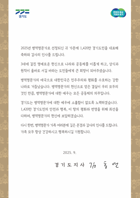 김동연 경기도지사는 서한문을 통해 “병역명문가의 애국으로 대한민국은 민주주의와 평화를 수호하는 강한 나라로 거듭났다”면서 “경기도는 병역명문가에 대한 예우에 소홀함이 없도록 노력하겠으며, 헌신에 보답하겠다”고 감사와 존경의 뜻을 표현했다.