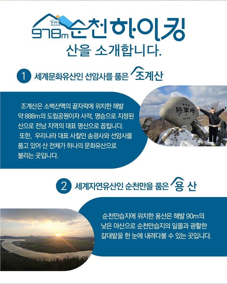 유네스코 세계유산 선암사와 세계자연유산 순천만습지를 연결하는 생태하이킹 챌린지로 조계산(888m)에서 용산전망대(90m)까지 총 978m의 상징적 고도를 따라, 순천의 자연과 문화, 그리고 사람을 하나의 여정으로 엮는다.