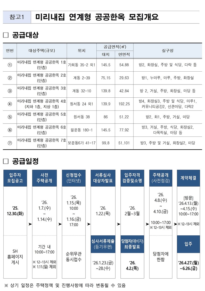 - 1.7.(수)~1.14.(수) 공급 예정 한옥 개방행사, 1.12.(월) 원서동서 현장 설명회도