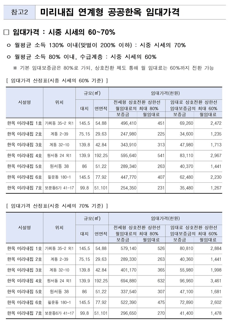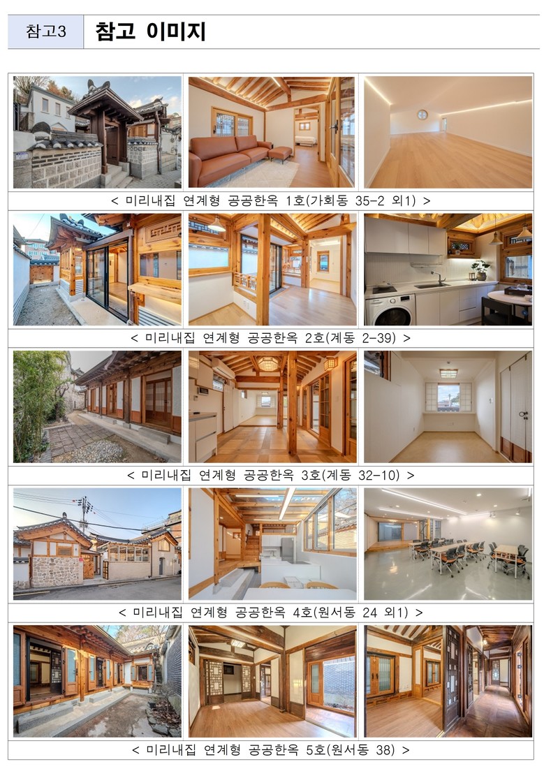 <종로 6곳‧성북 1곳, 총 7곳 공급… 방1~4개, 마당, 누마루 등 다양한 구조‧유형>