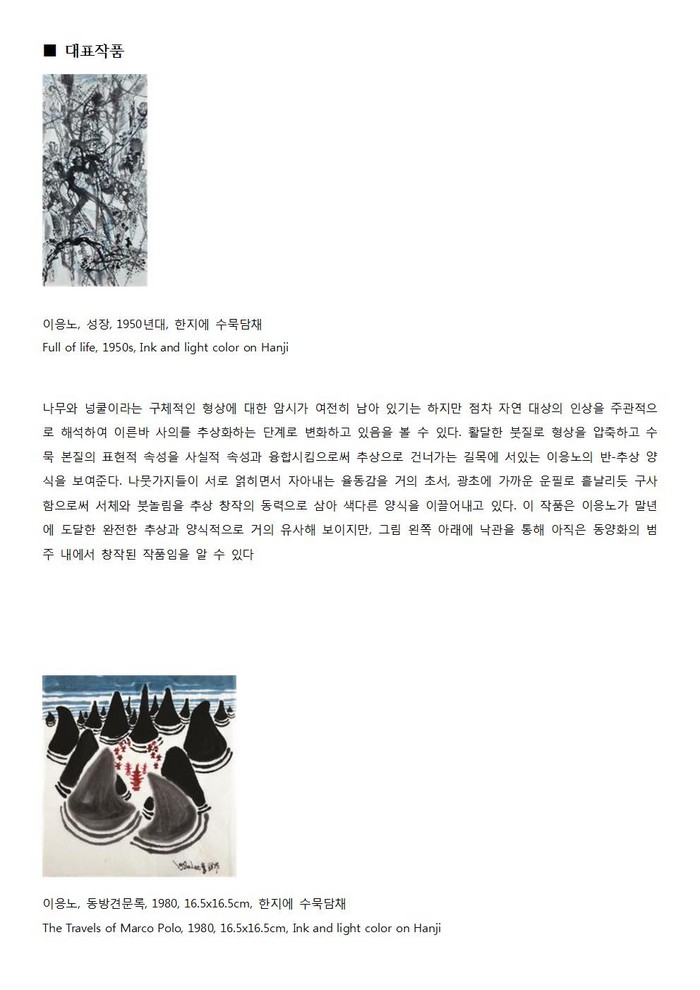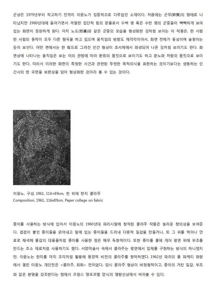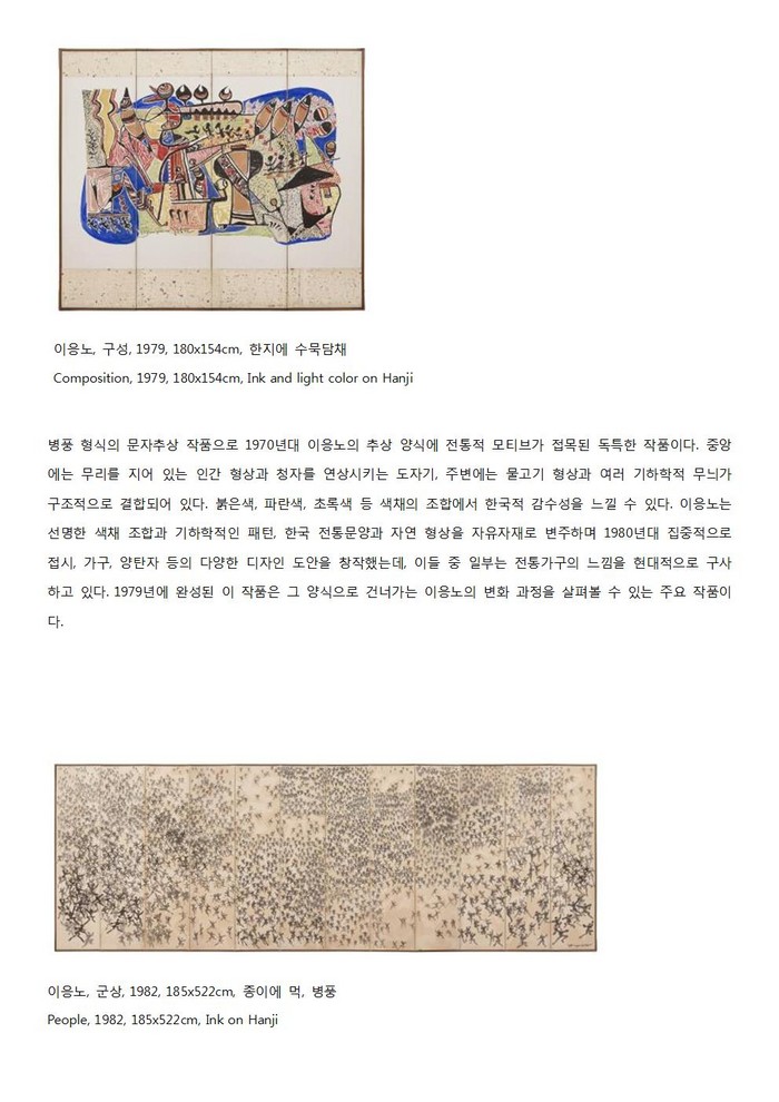 ○ 이응노는 한국 전통미술 바탕 위에 서구 추상양식의 새로운 길을 개척한 모더니스트라 할 수 있다. 그는 먹과 종이, 한자라는 전통적 재료와 소재를 가지고 추상화를 창작했다는 점에서 1950년대에 파리로 건너가 추상을 시도한 한국의 여타 화가들과 차별점이 있다.