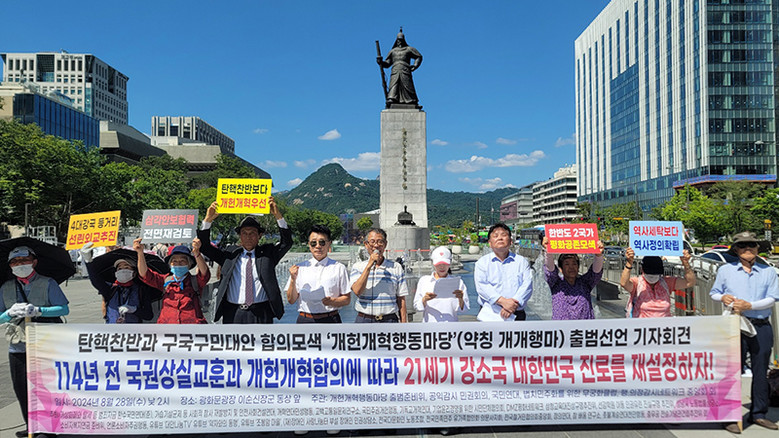 이처럼 폭풍전야와 같은 복잡하고 미묘한 정세에서 어제(8.28, 수) 낮 2시부터 약 30분 동안 서울 종로구 광화문광장 이순신장군동상 앞에서 ‘개혁연대민생행동’ 등 27개 시민단체 회원 10여 명이 <탄핵찬반과 구국구민대안 합의모색 ‘개헌개혁행동마당’(약칭 개개행마) 결성선언> 기자회견을 개최했다.