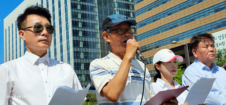 <8.28(수) 낮 2시부터 광화문광장 이순신장군동상 앞에서 개최한 <‘개헌개혁행동마당’(약칭 개개행마) 결성선언> 기자회견에서 송운학 상임대표의장이 발언하고 있다.(사진제공 개개행마)>