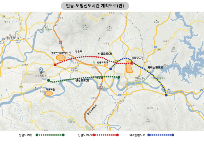 안동·예천권 30만 인구를 목표로 한다면, 새로 개설되는 도로는 최소한 6차선 이상으로 넓어야 하고, 도시의 균형 연계 발전을 도모할 수 있도록 설계되어야 한다. 도로의 높이를 높인 자동차 전용도로 형태는 최소한에 그치고 지면에 닿은 도로를 만들어 도로변 상가와 주택이 자연스럽게 들어서도록 해야 한다. 이에 따라 도청신도시간 두 개의 도로가 더 개설되기를 제언한다.