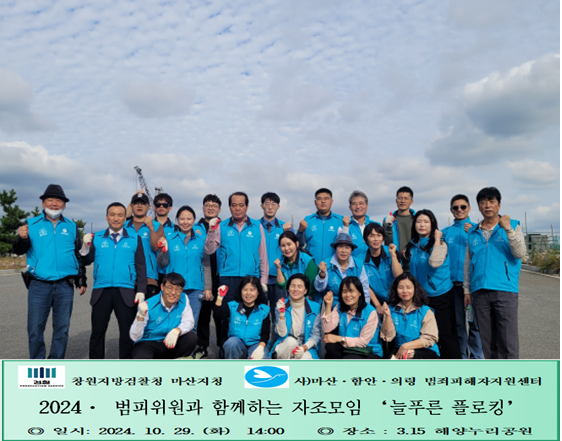 플로깅은 걷거나 뛰면서 쓰레기를 줍는 행동을 말한다. 이 행사는 마산 3·15 해양누리공원에서 약 1.5km 국화축제 지점과 반대 일대를 돌며 각자 지급받은 플로깅 집개와 쓰레기봉투를 사용해 버려진 쓰레기를 수거하는 행사이며, 마산·함안·의령 범죄피해자지원센터 홍보와 피해자 발굴과 각 분과 위원과 단합을 위해 프로그램을 실시 하였다.