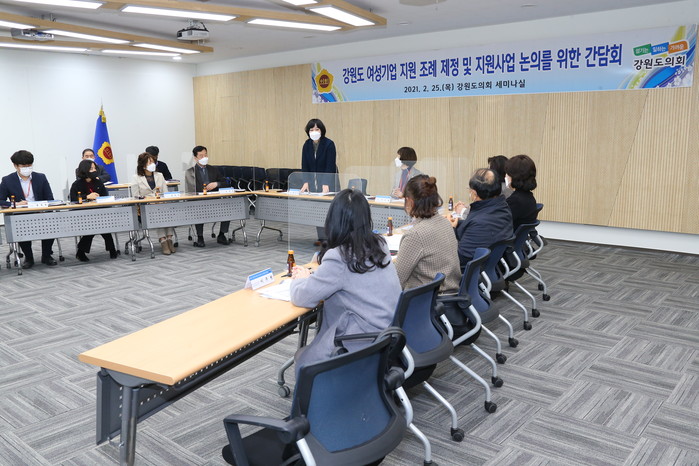 2월 25일(목) 14:00 강원도의회 세미나실에서 강원도 여성의 기업활동과 창업을 지원하여 여성의 경제활동 촉진과 여성기업인 지위향상을 통하여 지역경제 발전을 도모하고자 간담회를 개최하였다.