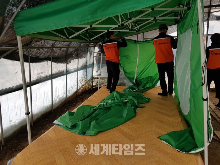 [대전=세계타임즈 이장성 기자] 6천명 회원들이 활동하고 있는 SNS 봉사단체인 사랑의 사다리 밴드(리더 이정제)는 10일 대덕구 이현동에서 비닐하우스에서 모기장안에서 추운겨울을 보내고 있는 농아인 독거어르신께 천막설치를 해드리면서 우리 사회의 따뜻한 사랑을 전달하였다.