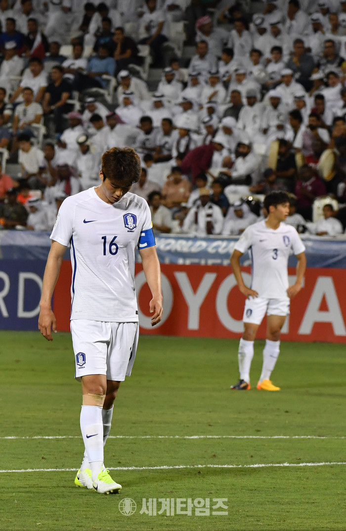 13일 오후(현지시각) 카타르 도하 자심 빈 하마드 스타디움에서 열린 '2018 러시아 월드컵 아시아 최종예선 A조 8차전' 대한민국 대 카타르 경기, 후반전 2-3으로 한국의 패색이 짙어진 뒤 얻은 코너킥에서 주장 기성용이 고개를 숙이고 있다. 2017.06.14.
