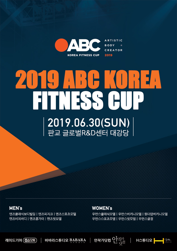 이번 ABC 코리아 피트니스 컵은 남자종목 ABC맨즈클래식보디빌딩, ABC맨즈피지크, ABC맨즈클래식모델, ABC맨즈머슬모델, ABC맨즈스포츠모델, ABC맨즈비치바디, ABC맨즈핏모델, ABC맨즈쿨가이 등으로 나뉘며, 여자종목은 ABC우먼즈클래식모델, ABC우먼즈비키니모델, ABC원더맘비키니모델, ABC우먼즈스포츠모델, ABC우먼즈핏모델, ABC쿨걸 종목으로 열린다.