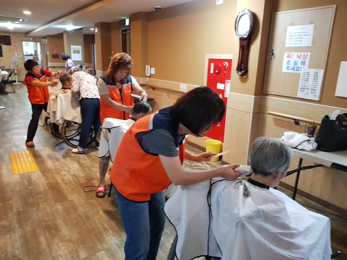 이날 미용봉사에는 송남석 단장을 비롯해서 김미경 김현옥 이미향 이하영 조은숙 가위천사들이 1층, 3층, 별관에서 70명의 치매 및 와상 어르신들을 위하여 미용봉사를 하였다.