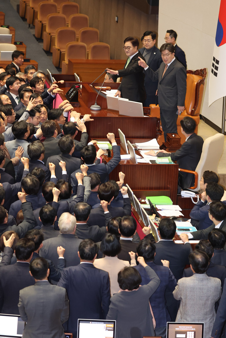[세계타임즈 = 심귀영 기자] 우원식 국회의장이 27일 오후 국회 본회의에서 한덕수 국무총리 탄핵소추안 가결 의결정족수에 대한 설명(재적의원 과반수 찬성)을 하자, 국민의힘 권성동 대표 권한대행 겸 원내대표가 의장석에 올라가 항의하고 있다. 2024.12.27