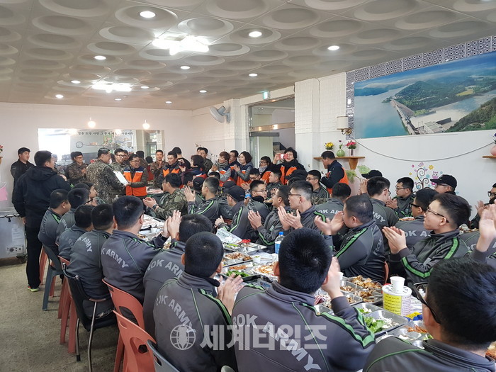 [대전=세계타임즈 이장성 기자] “무사고 안전작전 100일!”을 달성한 육군 제32사단대덕대대(대대장 박종림)에 회원 6천명이 활동하는 사랑의 사다리 밴드(리더 이정제)의 20명 회원들이 즉석에서 구운 바베큐 통닭을 전달하면서 훈훈한 이웃사랑을 전했다.