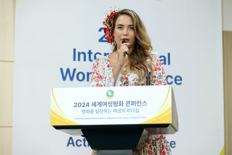 | ▲19일 경기도 가평군 소재 켄싱턴리조트에서 열린 ‘2024 세계여성평화 콘퍼런스’에서 마리아 마르따 라꾸뚜르(Hon. Maria Martha Lacouture) 콜롬비아 바예두파르시청 경제개발·환경 및 관광부 국장(Secretary of Economic Development, Environment and Tourism, Valledupar City Hall)이 오픈마이크 세션에서 발언하고 있다. (제공: IWPG) |
