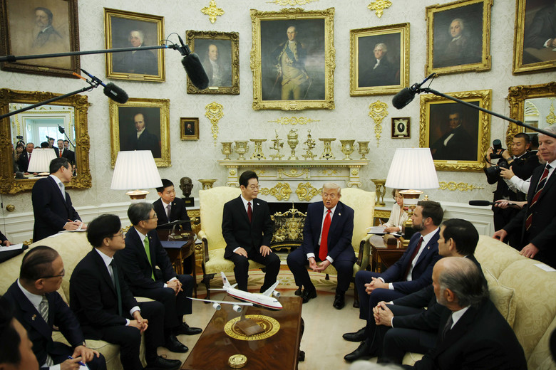 이재명 대통령과 도널드 트럼프 미국 대통령이 25일(현지시간) 미국 워싱턴DC 백악관에서 정상회담을 하고 있다. 2025.8.26