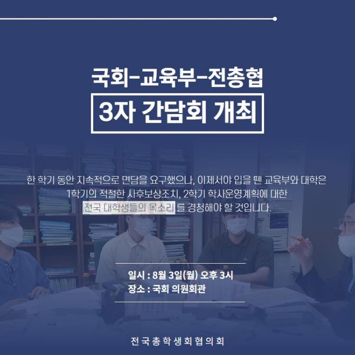 전국총학생회협의회(전총협) 따르면, 지난 3일 국회에서 코로나19로 인한 대학가 재난 상황 극복을 위한 ‘교육부‧국회‧전총협’의 3자 간담회가 열렸다. 자세한 논의 내용은 아직 밝혀지지 않았다.
