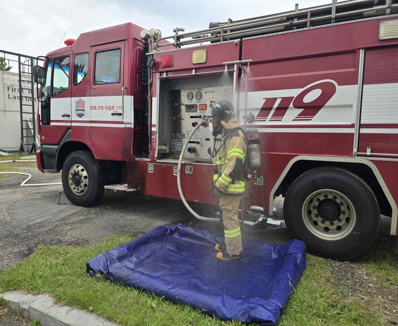 충남소방본부는 유해물질 노출과 열 스트레스라는 이중 위험에 대응할 수 있도록 ‘데콘(Decon) 노즐’을 자체 개발하고, 이를 기반으로 ‘유해인자 제거 통합관리체계’를 구축할 예정이라고 18일 밝혔다.