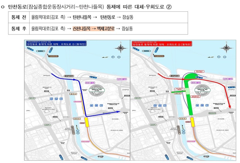 ② 올림픽대로(김포 측)에서 잠실동으로 이동하는 차량은, 기존 탄천동로(탄천나들목) 대신 백제고분로(신천나들목)를 이용하면 된다.