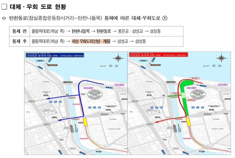 - 공사 기간 동안 신설·개통(동부간선 대치나들목, 탄천 하상 우회도로)하는 대체도로 이용 당부