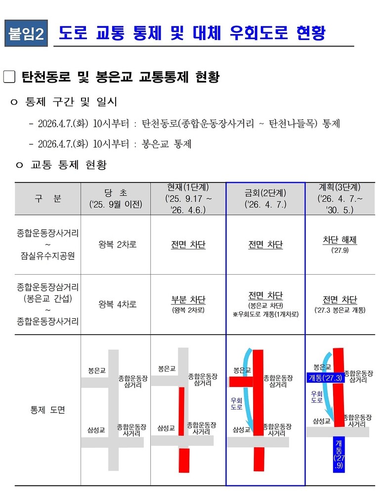 - 공사 계획에 따라 7일(화) 10시부터 봉은교·탄천동로 통제 시작