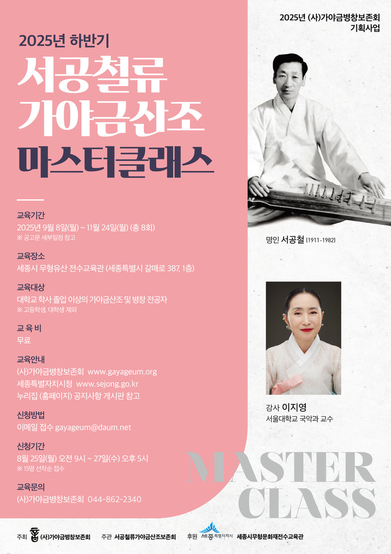 또한, 가야금 전공자를 대상으로 심도 있는 교육을 제공하는 ‘서공철류 가야금산조’ 전문교육(마스터 클래스)도 하반기 수강생을 모집한다.