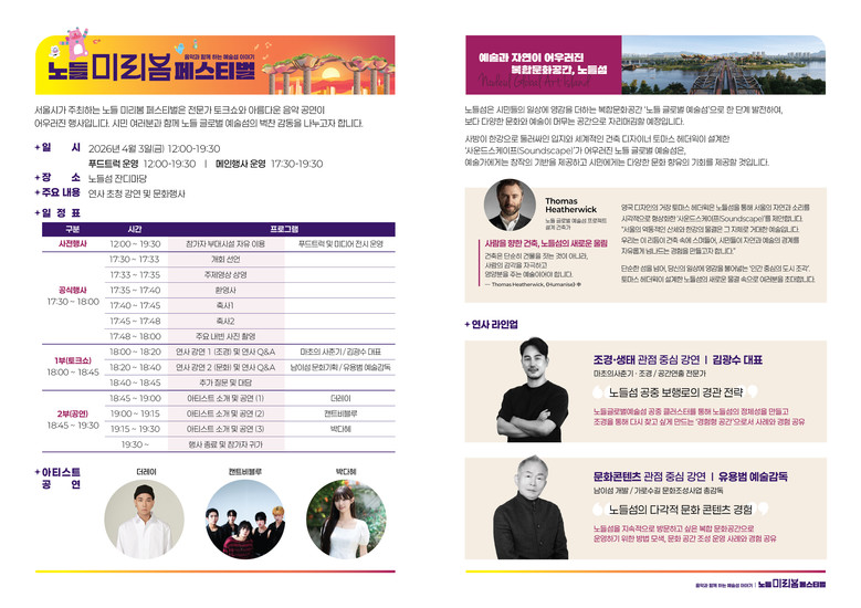 2부 음악 공연은 한강의 일몰 시간대에 맞춰 진행되며, 노들섬의 풍경과 소리가 어우러지는 공간 경험을 통해 예술섬의 방향을 시민들이 자연스럽게 공감할 수 있도록 기획됐다.
