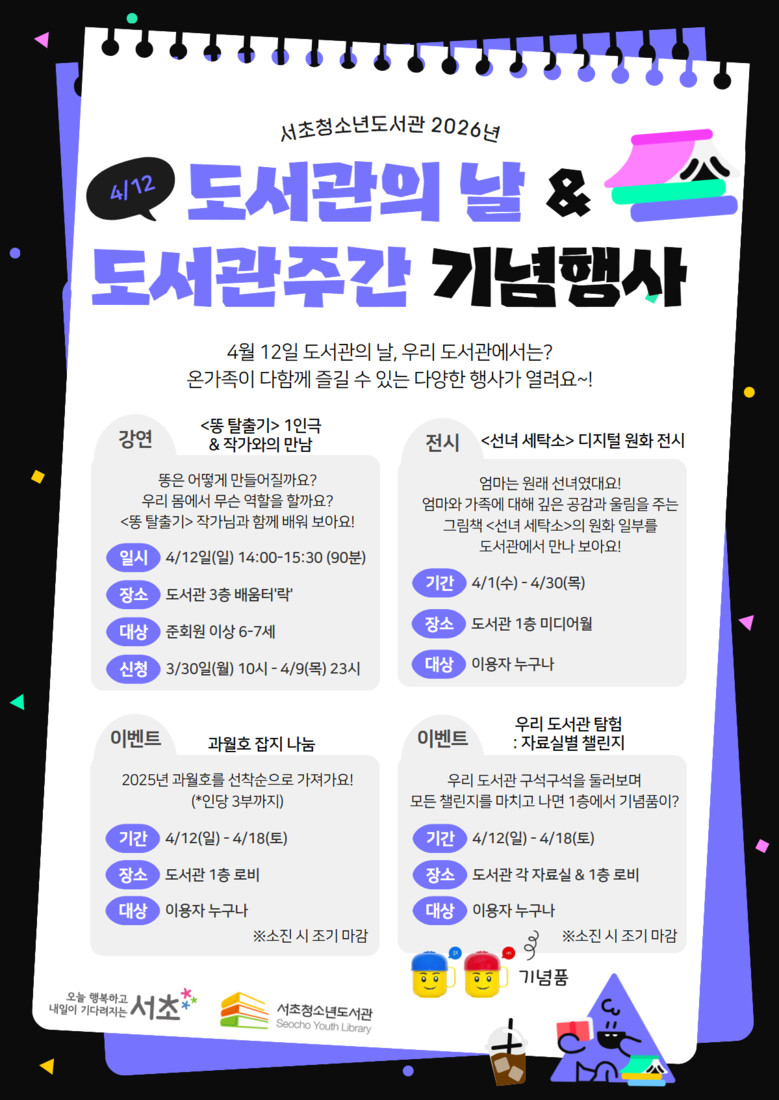 아울러 서초청소년도서관은 어린이·청소년 특화 프로그램을 선보인다. 12일 「똥 탈출기」 1인극에 이어 작가와의 만남을 통해 어린이들의 상상력을 자극하고, 한 달간 미디어월을 통한 디지털 원화 전시 「선녀 세탁소」와 자료실별 미션 챌린지를 진행한다.