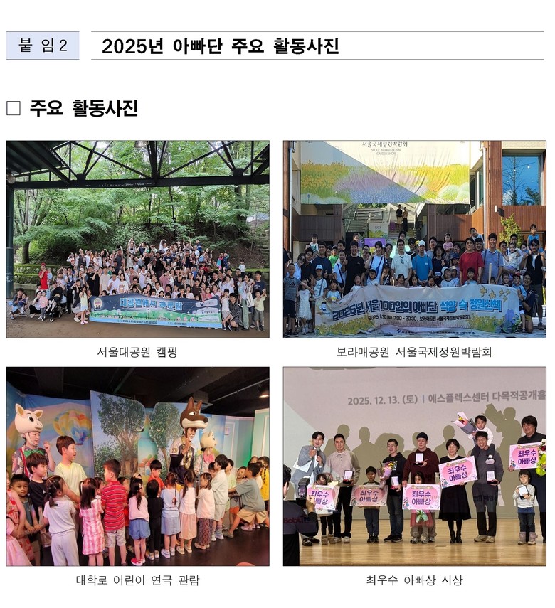 특히, 올해 서울시는 남성 육아에 대한 인식 개선 및 가족 친화 육아 환경 조성 등 저출생 대응 정책 기조에 맞춰 아빠들의 적극적인 육아 참여를 유도하기 위해 기존 100인 규모의 아빠단을 200인으로 확대 선발할 예정이며, 다자녀 및 다양한 연령대 등을 고려해 보다 내실있고 특색있는 아빠단을 구성·운영할 계획이다.
