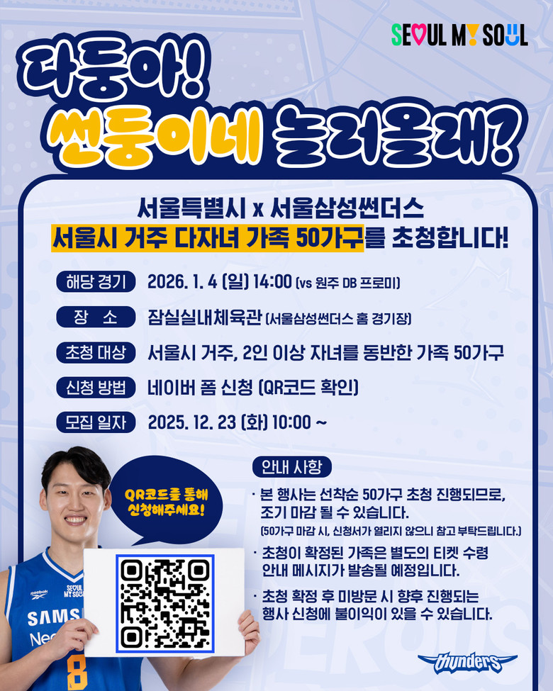 - 市, “연고 구단과 지속적으로 협력해 모두가 즐기는 ‘스포츠 도시, 서울’ 만들어 갈 것” [서울 세계타임즈=이장성 기자] 서울시가 2026년 새해를 맞아 1월 4일(일) 오후 2시 잠실실내체육관(송파구 올림픽로 25)에서 열리는 서울시 연고 구단 ‘서울삼성썬더스농구단’의 홈경기에 다자녀 50가족을 무료 초청한다.