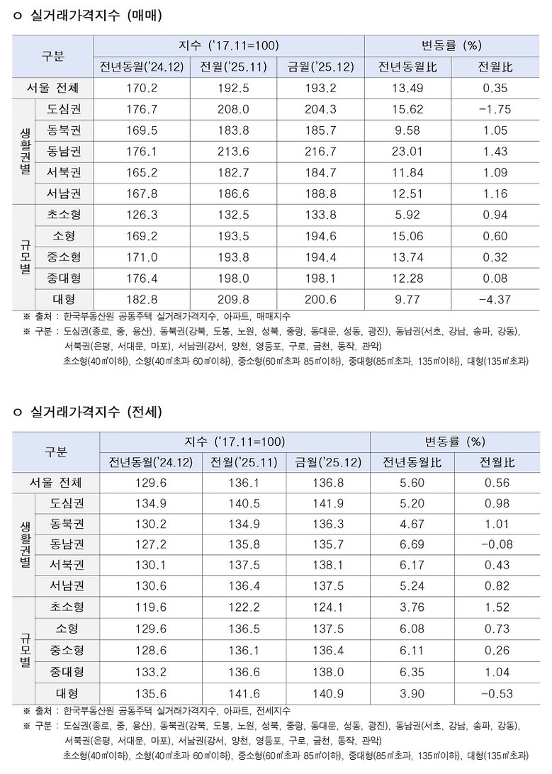 12월 실거래가격지수는 2025년 12월 1일부터 31일까지 체결된 매매계약 중 부동산 거래신고 등에 관한 법률에 따라 계약체결일로부터 30일 이내 신고가 완료된 실거래 자료 전수를 분석해 산출했다.
