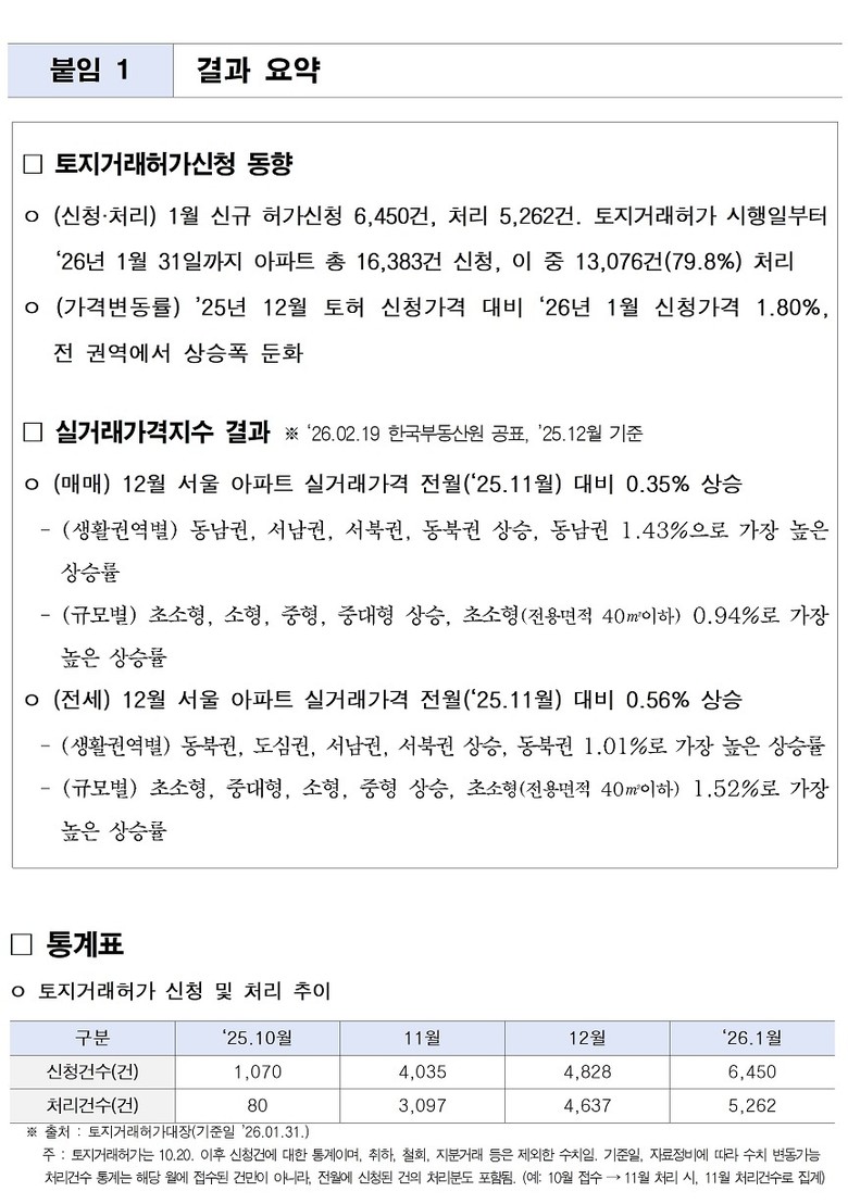 ‘26년 1월 말 기준 아파트 토지거래허가 신규 신청건수는 전월 대비 33.6% 증가한 6,450건이며, 1월 토지거래허가 처리건수는 5,262건으로 이는 향후 계약으로 이어져 매매거래 신고건수에 반영될 예정이다.