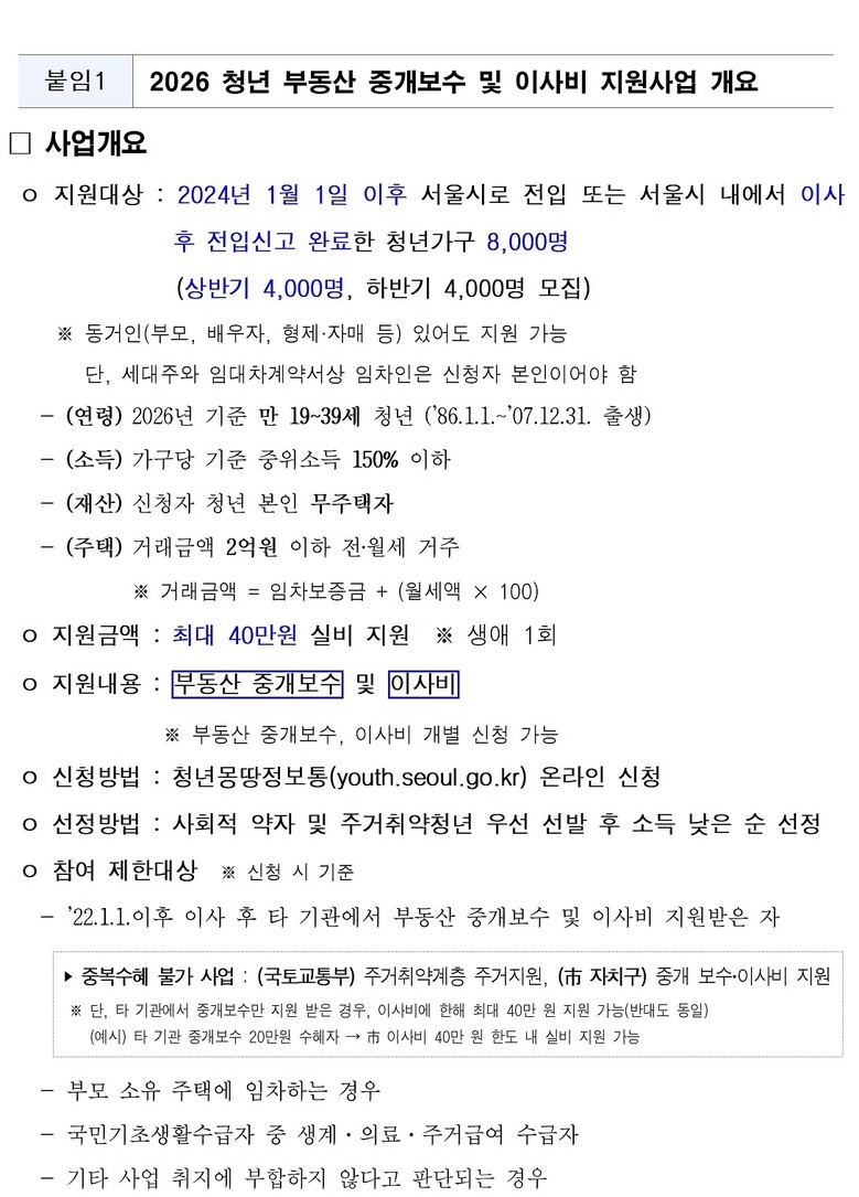 ‘청년 부동산 중개보수 및 이사비 지원사업’은 학업, 취업 등으로 이사가 잦은 청년들의 부담을 덜어주기 위해 서울시가 2022년부터 시행 중인 청년 주거지원 정책이다. 만 19~39세 서울 거주 무주택 청년을 대상으로 부동산 중개보수 및 이사비를 최대 40만 원까지 지원한다.