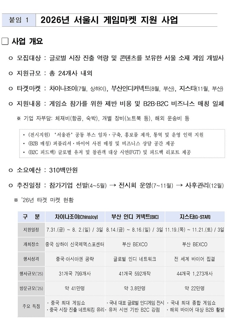 특히, 서울시는 중국 최대 게임쇼인 ‘차이나조이’에서 서울관을 운영해 아시아권 시장 진출의 교두보를 마련할 계획이다. 이어 ‘BIC’에서는 인디게임 중심의 글로벌 네트워크와 유저 피드백을 수집하고, ‘지스타’에서는 국내외 주요 바이어 중심의 B2B 기회를 집중 공략할 예정이다.