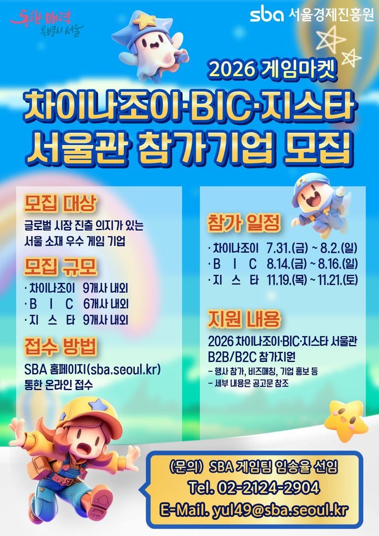 - 시, “중소 게임사의 글로벌 무대 진출을 돕는 든든한 파트너가 될 것” [서울 세계타임즈=이장성 기자] 서울시와 서울경제진흥원(SBA)은 서울 소재 우수 게임 콘텐츠의 해외 시장 개척 및 판로 확대를 지원하기 위해 ‘2026 게임마켓 서울관’ 참가기업을 모집한다고 밝혔다.