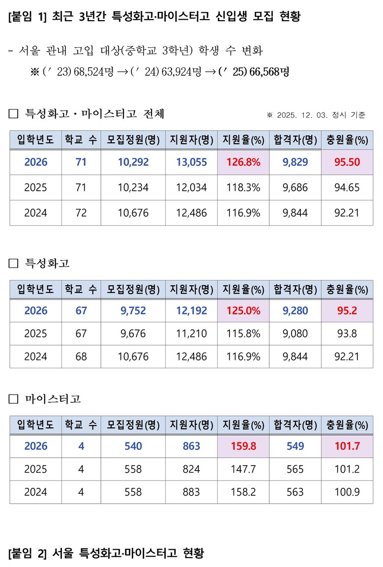 2026학년도 신입생 모집은 모집정원 10,292명 대비 13,055명 지원하여 지원율 약 126.8%를 기록하였다. 이 중 마이스터고(4교)는 △모집정원 540명 △지원자 863명(지원율 159.8%) △합격자 549명(충원율 101.7%)로 3년 연속 100% 이상 학생 충원을 유지하였다.