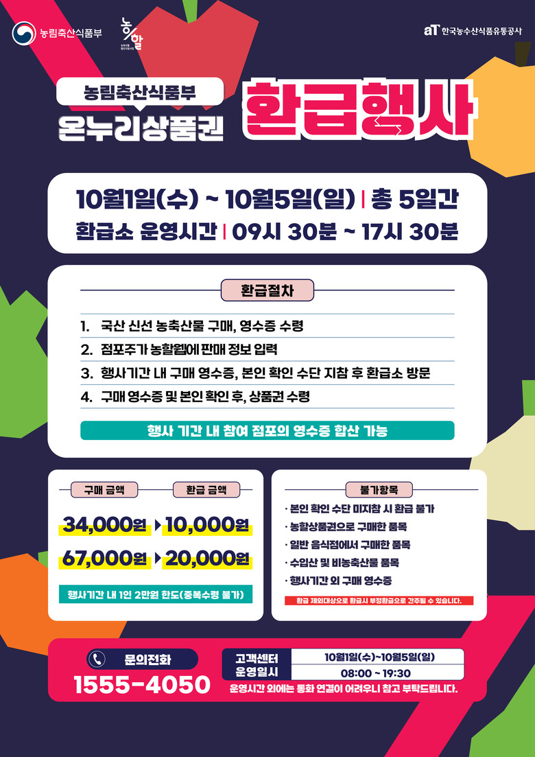 농림축산식품부가 주관하는 이번 행사는 행사 참여 전통시장에서 국산 신선 농축산물을 구매한 소비자에게 구매 금액의 최대 30%를 온누리상품권으로 환급하는 방식으로 운영된다.