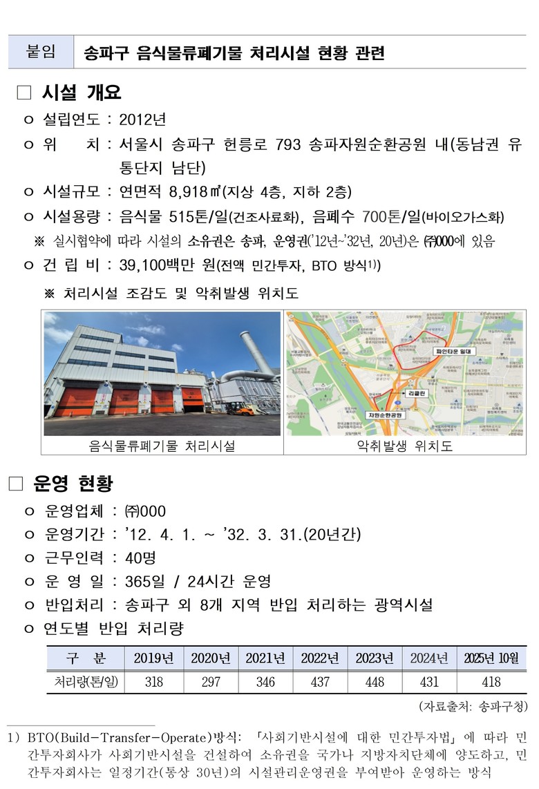 서울시 시민감사옴부즈만위원회(위원장 조덕현, 이하 ‘위원회’)는 송파구 헌릉로 송파자원순환공원내 설치된 ‘송파구 음식물류 폐기물 처리시설’에서 운영사가 구청 묵인하에 관외 폐기물을 처리하여 악취 개선공사 이후에도 지속적으로 악취가 발생하여 주민들이 고통을 겪고 있다며 송파구 주민 223명이 제기한 주민감사에 대해 지속적인 악취 개선공사로 악취 발생이 일부 개선되기는 했지만, 악취개선시설의 용량 부족으로 근본적인 해결에는 한계가 있으며, 근본적인 해결을 위해 시설 지하화 등 4건의 대책을 마련할 것을 골자로 한 감사 결과를 통보했다.