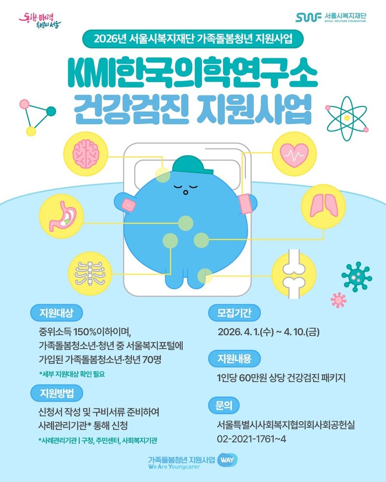 올해 3년 차에 접어든 가족돌봄청년 건강검진 지원사업은 KMI의 후원으로 진행되고 있으며 4월 1일(수)부터 4월 10일(금)까지 신청을 받는다.
