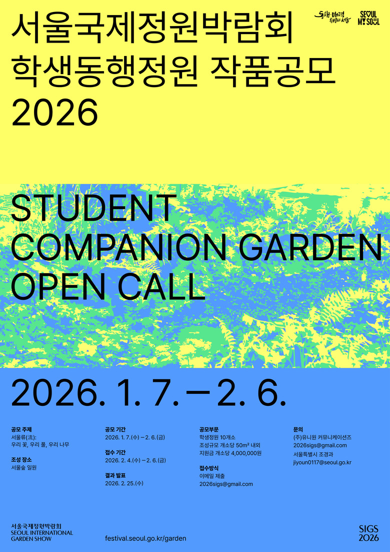 서울시는 창의적인 정원 디자인 발굴과 정원문화 확산을 위해 이달 7일(수)부터 다음달 6일(금)까지 「2026 서울국제정원박람회」 학생동행정원(이하 학생정원) 및 시민동행정원(이하 시민정원) 작품공모를 진행한다고 밝혔다.