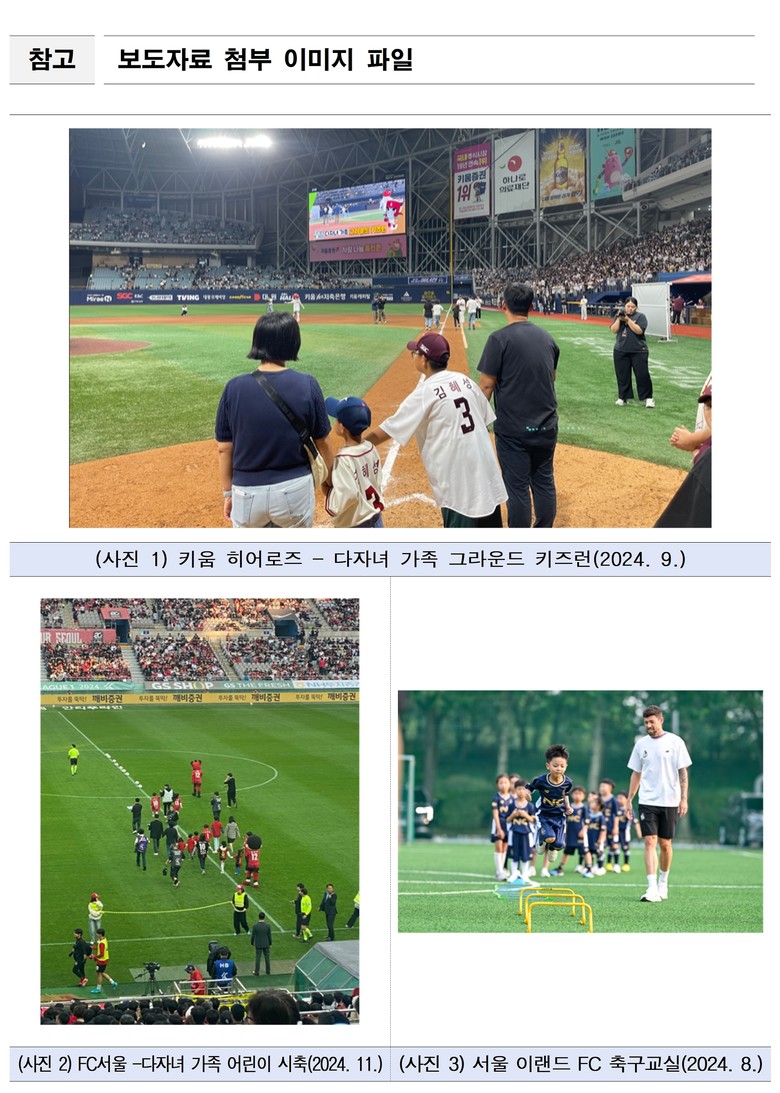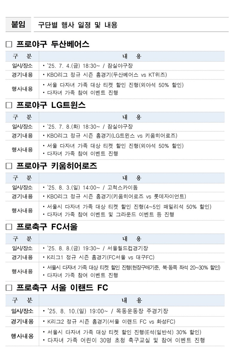 서울시는 7~8월 여름휴가를 맞아 서울시연고 야구‧축구 프로구단들과 함께 다자녀 가족을 위한 경기 관람권 할인 이벤트와 다양한 참여형 프로그램을 운영한다고 밝혔다.