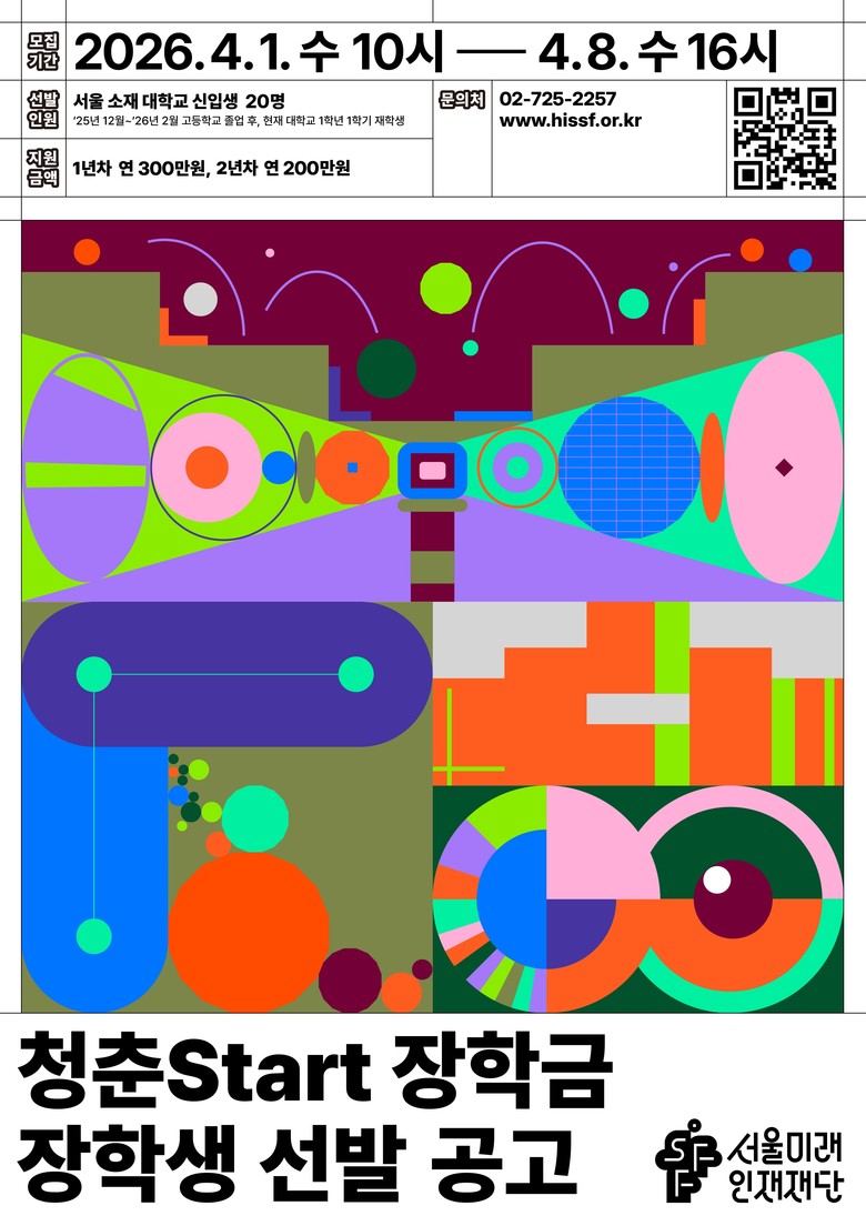- 1일(수)~8일(수)까지 재단 누리집서 접수…㈜두산과 함께하는 프로그램‧장학생 간 교류 참여 기회도 [서울 세계타임즈=이장성 기자] 서울미래인재재단(이하 재단)이 ㈜두산 임직원 기부금으로 14년째 운영 중인 「청춘Start장학금」 14기 장학생 20명을 모집한다. 서울 소재 대학에 올해 입학한 저소득 신입생을 대상으로 2년간 총 500만 원의 학업장려금을 지급하며, 신청은 4월 8일(수) 16시까지 재단 누리집(www.hissf.or.kr)에서 받는다.