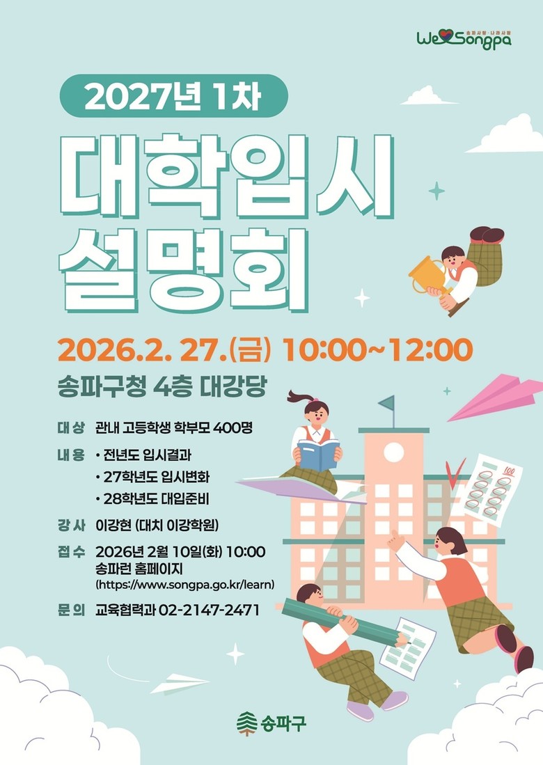 서강석 송파구청장은 “2027학년도는 입시 제도 변화 직전의 중요한 시기”라며 “학생과 학부모가 정확한 정보를 바탕으로 흔들림 없이 준비할 수 있도록 지원을 이어가겠다”라고 말했다.