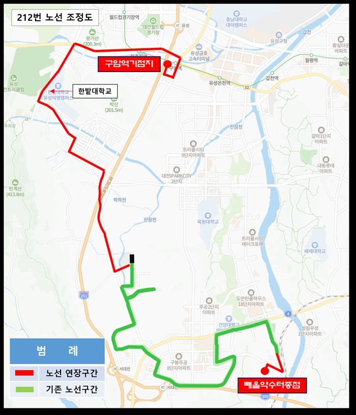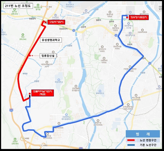 211번은 대정동화물터미널에서 대전정부청사까지 운행하던 노선으로 이번 조정을 통해 구암역에서 대전정부청사까지로 연장된다.
