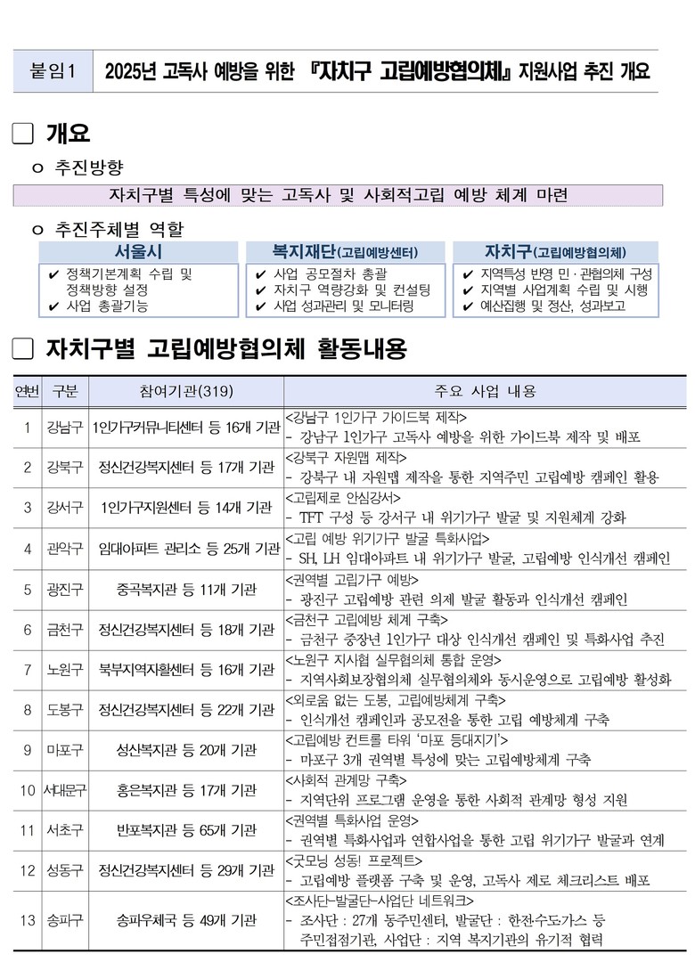 현재 강남구, 강북구 등 13개 자치구에 고립예방협의체를 설치해 운영 중이며, 복지관, 경찰서, 의사회, 공인중개사회, 야쿠르트 등 총 319개 기관이 함께 참여하고 있다.