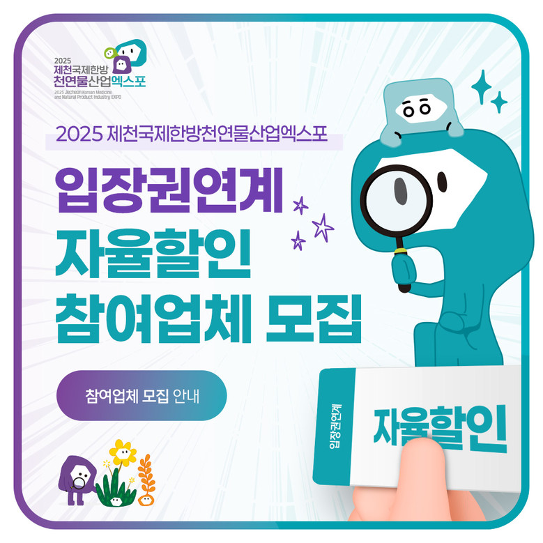 모집 대상은 식당, 카페, 숙박시설 등 제천시 관내 모든 업체이며, 엑스포 기간 중 입장권을 소지한 관람객에게 판매 품목 등을 할인 해주는 것으로 품목 및 금액은 업체가 자율로 결정하면 된다.