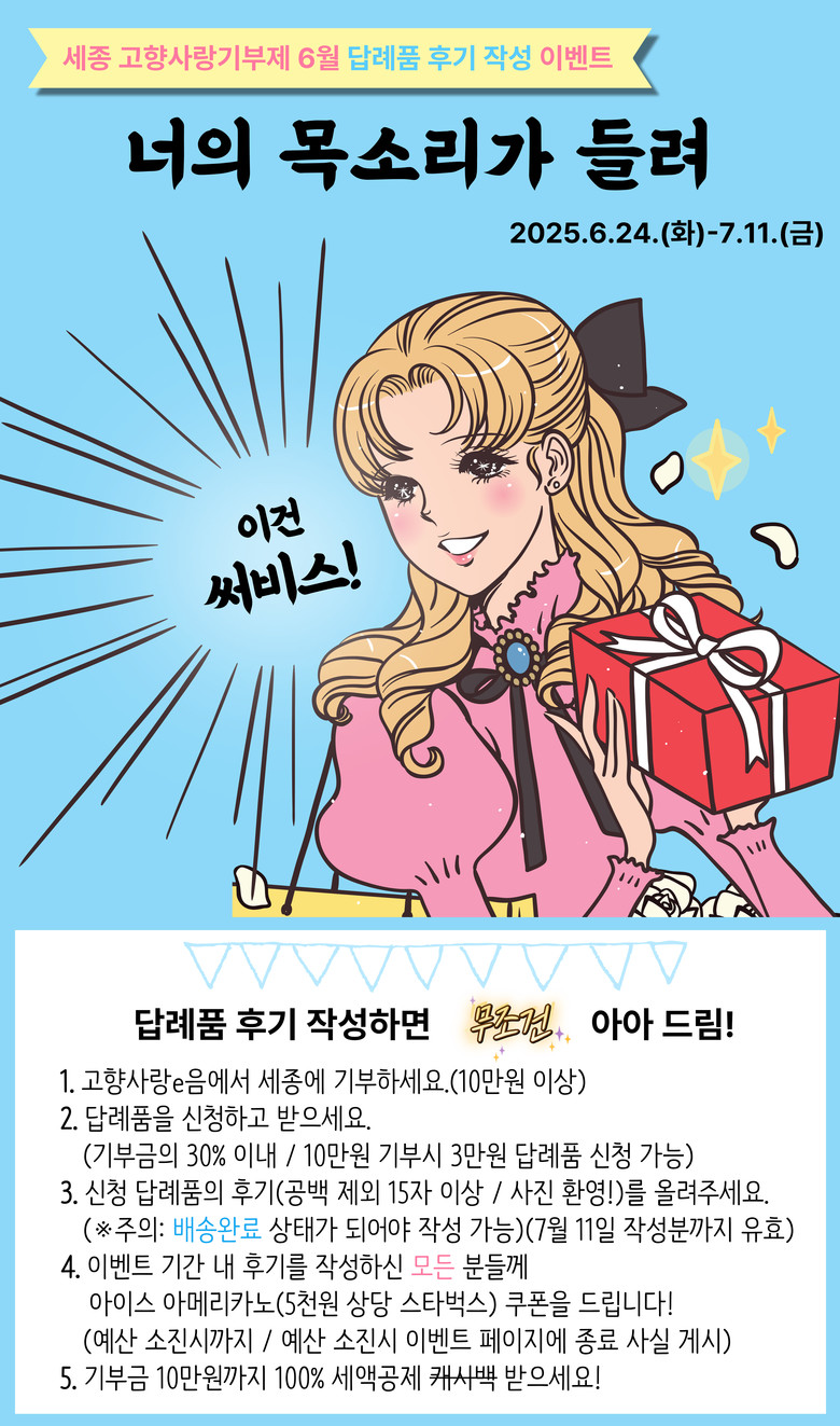 이번 행사는 세종 고향사랑기부제에 10만 원 이상 기부하고 답례품을 신청·수령한 뒤 후기를 작성한 기부자라면 누구나 참여할 수 있다.