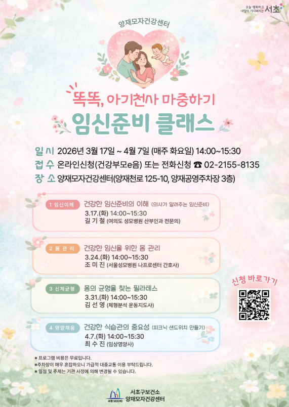 먼저 3월 5일부터 진행되는 신규 과정 ‘아빠랑 튼튼놀이’에서는 아빠(할아버지)와 아이가 함께하는 신체활동을 통해 영유아의 대·소근육 발달 및 기초체력 증진을 돕는다. 이어 3월 17일부터 시작되는 ‘임신준비 클래스’는 건강한 임신준비를 위한 관리법, 필라테스, 식습관의 중요성 등 예비 부모들에게 꼭 필요한 양질의 정보를 제공한다.