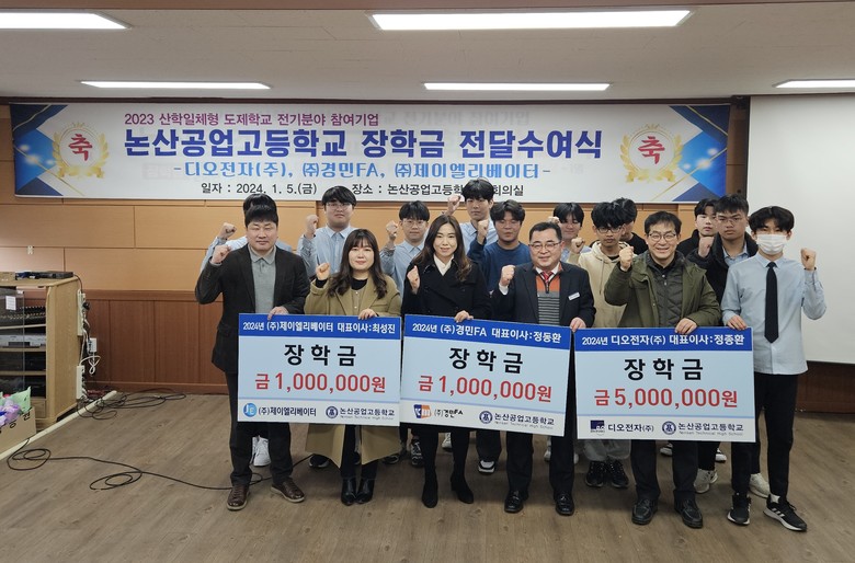 [논산시 세계타임즈=백택기 기자] 논산공업고등학교(교장 박병원)는 5일(금) 산학일체형 전기분야 도제교육기관인 디오전자(주)(대표이사 원종환) 장학금 500만원(3년 연속), ㈜경민FA(대표이사 정동환) 장학금 100만원, ㈜제이엘리베이터(대표이사 최성진)장학금 100만원을 전달받았다.