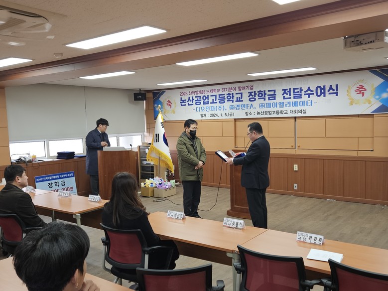 장학금 전달식에는 디오전자(주) 심봉학 이사와 ㈜경민FA 배선향 이사, ㈜제이엘리베이터 최성진 사장이 참석했으며, 이번에 전달받은 장학금은 다양한 교육 활동에서 우수한 역량을 보이는 10여명의 학생들에게 각 700만원씩 전달할 예정이다. 또한, 매년 도제학교 전기분야 학생들을 위해 장학금을 전달받아 2022년에는 500만원을 10명에게, 2023년에는 500만원을 9명에게 전달했다.